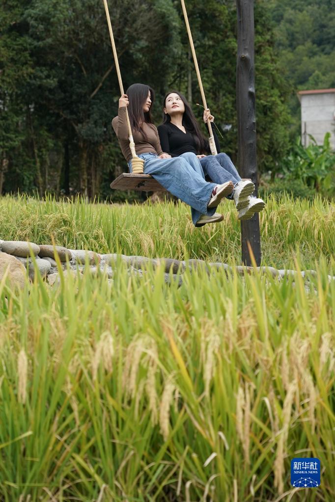 9月7日,游客在嵐皋縣南宮山鎮桂花村古梯田蕩秋千。