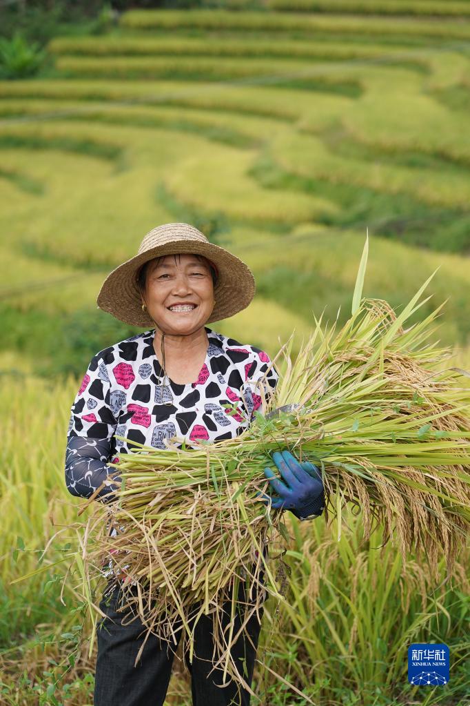 9月7日,嵐皋縣南宮山鎮桂花村村民展示收割的水稻。
