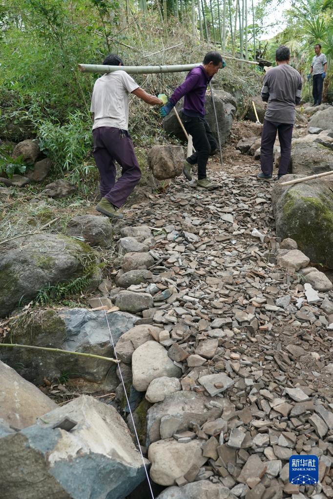 9月7日,嵐皋縣南宮山鎮桂花村村民在古梯田上修建一條旅游步道。