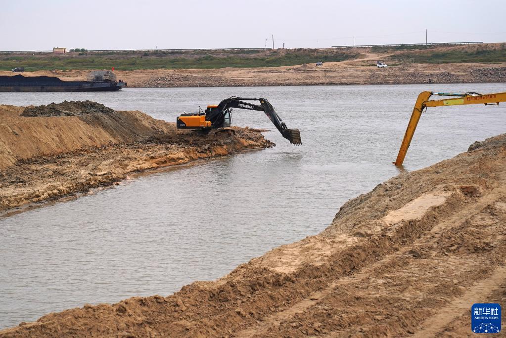 9月8日,在鄱陽(yáng)湖畔的南昌市新建區鐵河鄉一電排站,工作人員用挖掘機疏通引水渠(無(wú)人機照片)。