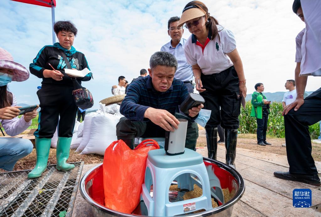 9月8日,工作人員在測產(chǎn)現場(chǎng)檢測“楚粳54號”稻谷水分。