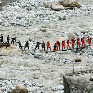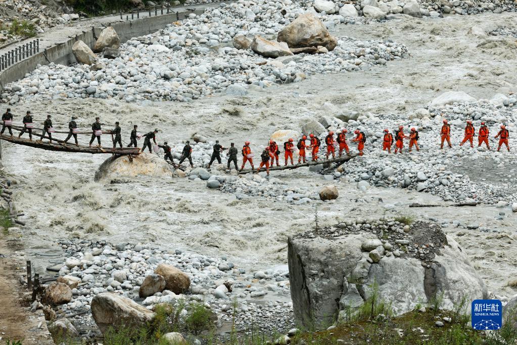9月8日,在四川省甘孜州瀘定縣磨西鎮附近,救援人員站在臨時(shí)架設的小橋上向河對岸的村民運送生活物資。