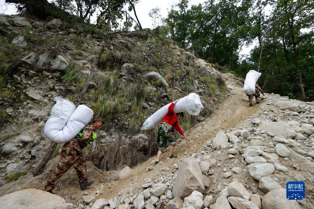 9月8日,在四川省甘孜州瀘定縣磨西鎮附近,救援人員沿著(zhù)被地震損壞的小路運送救災帳篷。