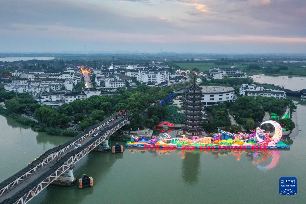 9月7日在周莊拍攝的正在調試中的燈彩(無(wú)人機照片)。
