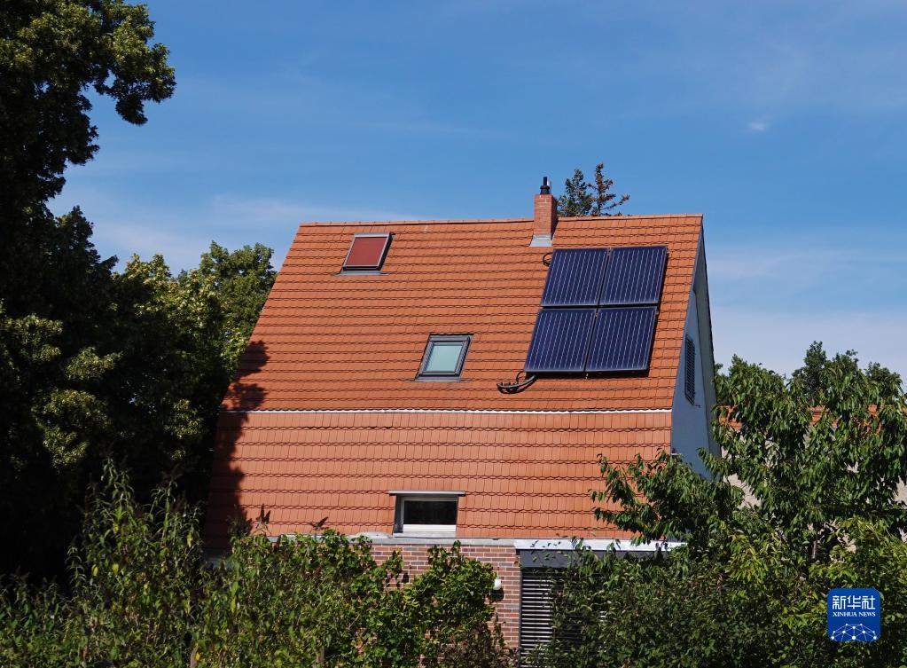 這是8月3日在德國柏林拍攝的一戶(hù)人家房屋上的太陽(yáng)能面板。