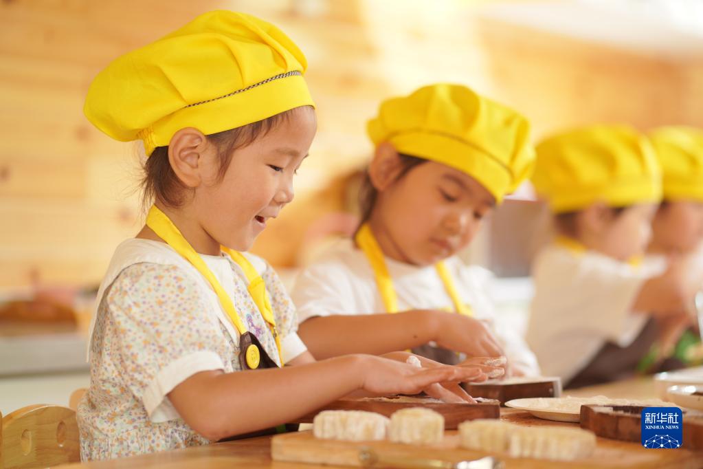 9月8日,河北省邢臺市內丘縣第三幼兒園的小朋友在制作月餅。