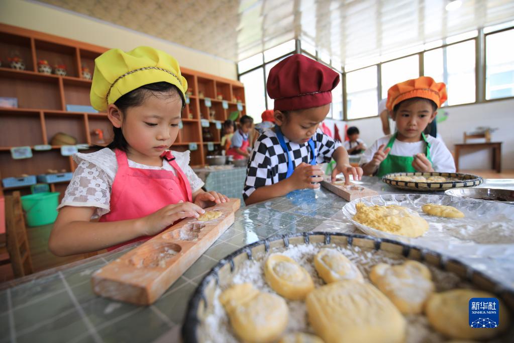9月8日,貴州省黔東南苗族侗族自治州從江縣剛邊壯族鄉中心幼兒園的小朋友在學(xué)習制作月餅。