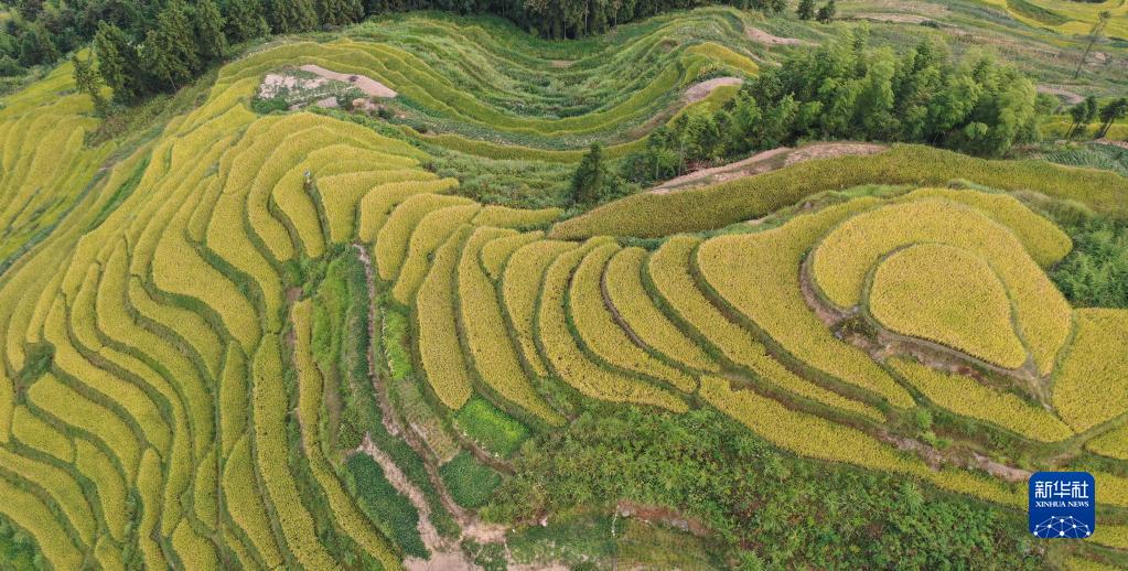 在中國農民豐收節即將到來(lái)之際,“世界灌溉工程遺產(chǎn)”“全球重要農業(yè)文化遺產(chǎn)”湖南省婁底市新化縣水車(chē)鎮紫鵲界梯田種植的水稻陸續進(jìn)入成熟期,田野一片金黃,農民利用晴好天氣搶收搶割。