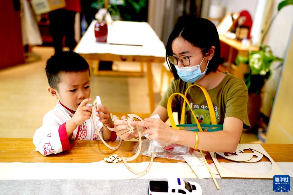 9月8日,家長(cháng)帶著(zhù)孩子體驗制作花燈。