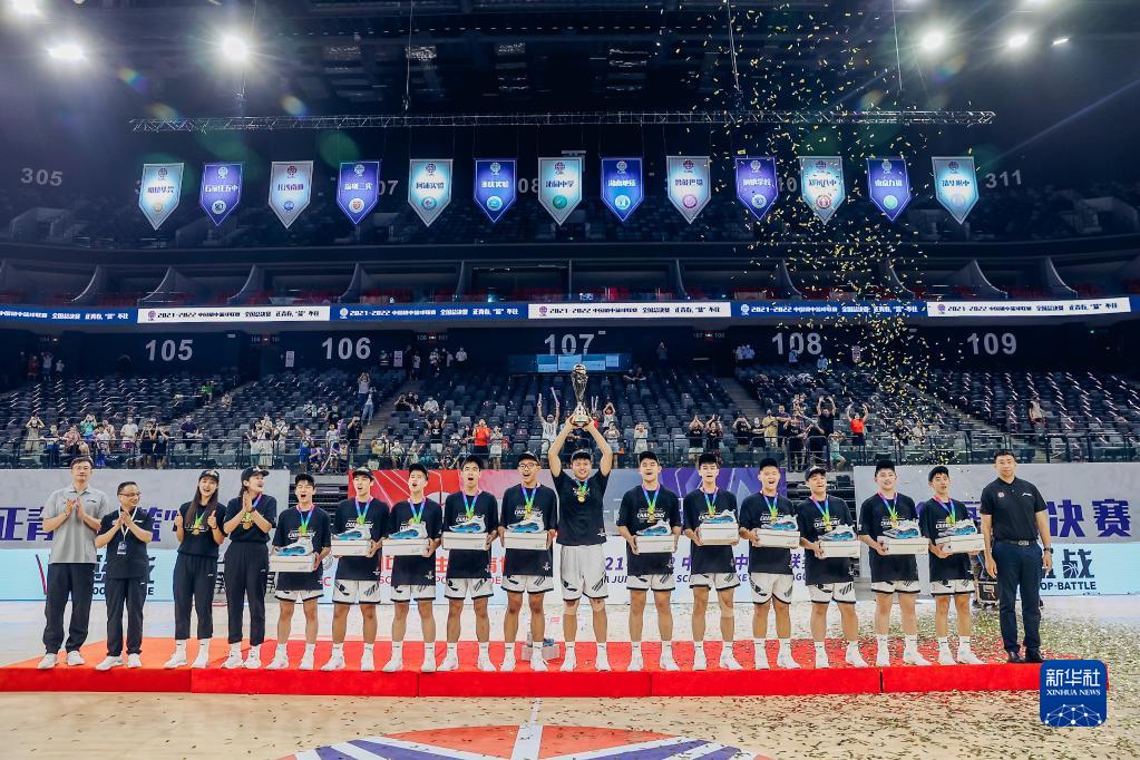 8月19日,明德華興中學(xué)獲得2021-2022賽季中國初中籃球聯(lián)賽男子組總冠軍后,于紅?。ㄗ笕┖完爢T們合影。