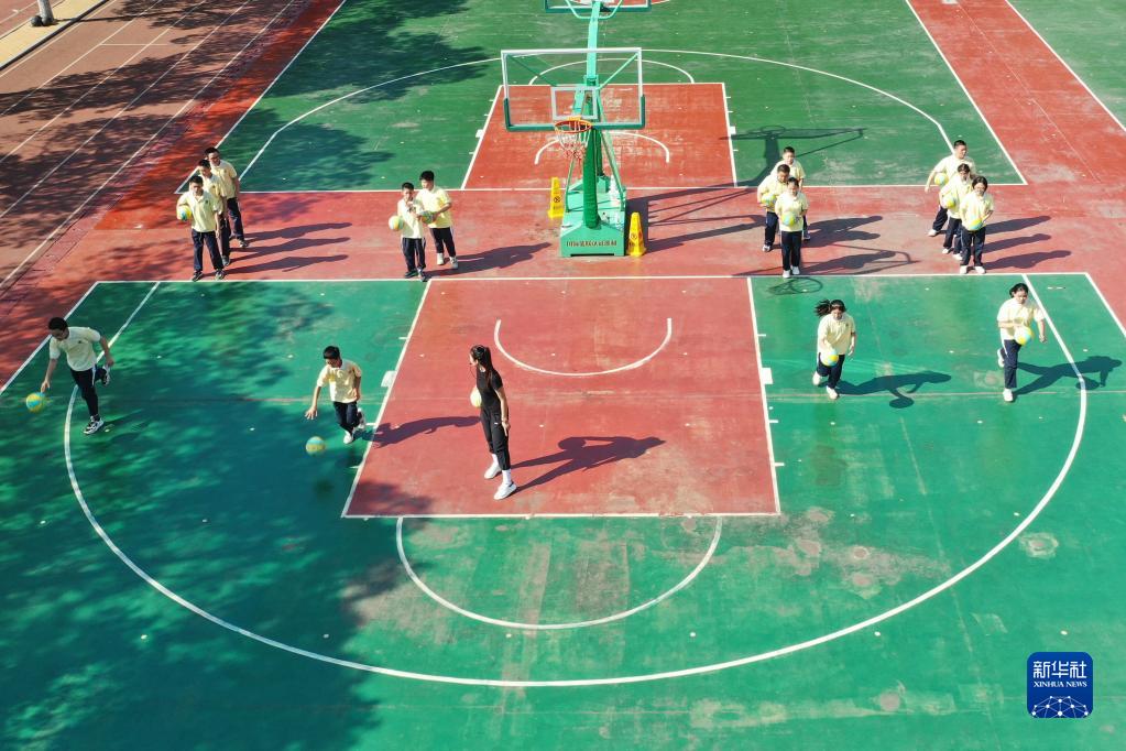 9月6日,于紅?。ㄇ爸校┰陂L(cháng)沙市明德華興中學(xué)給學(xué)生上體育課(無(wú)人機照片)。