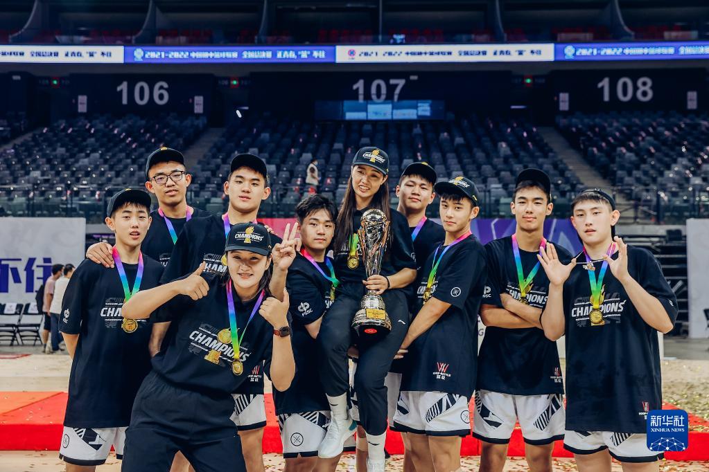 8月19日,明德華興中學(xué)獲得2021-2022賽季中國初中籃球聯(lián)賽男子組總冠軍后,于紅?。ㄓ椅澹┖完爢T們合影。