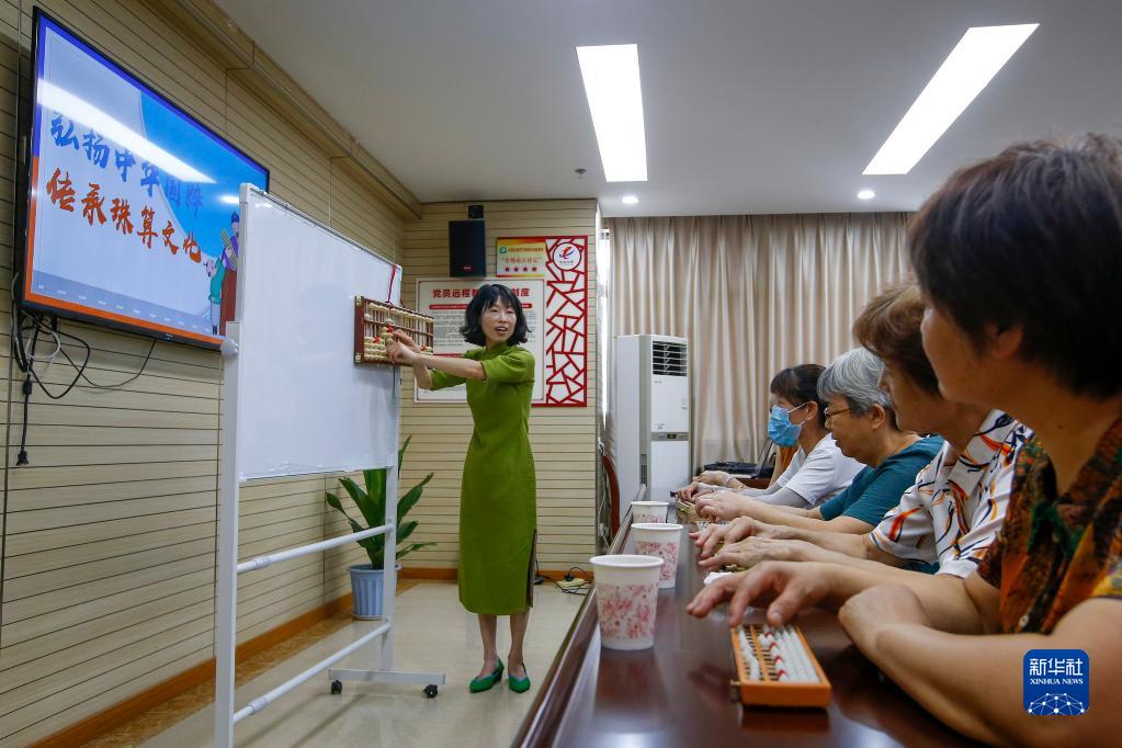 9月7日,在安徽省黃山市前園社區黨群服務(wù)中心,汪素秋為社區居民傳授珠算知識。