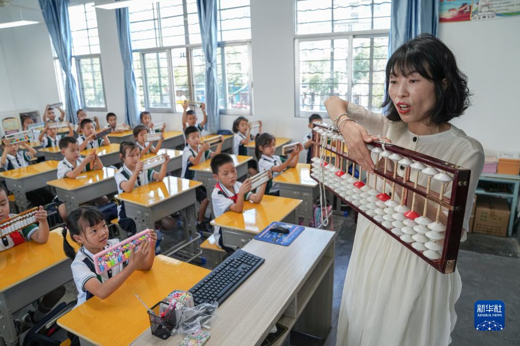 9月6日,在安徽省黃山市屯溪大位小學(xué),汪素秋在課堂上講解珠算知識。