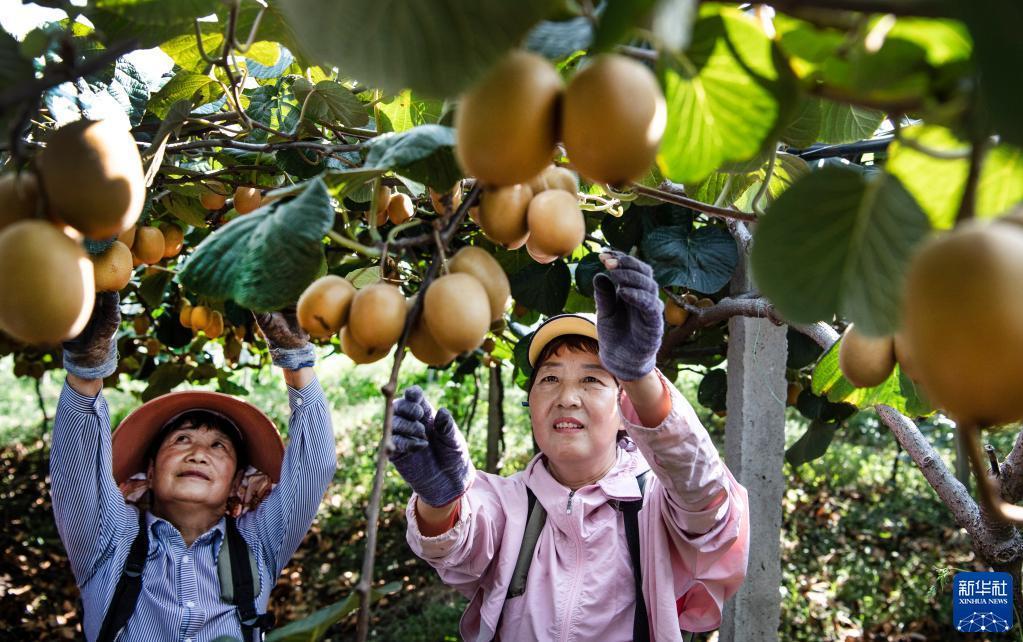 9月9日,當地村民在陜西齊峰果業(yè)城固基地采摘成熟的優(yōu)質(zhì)獼猴桃。