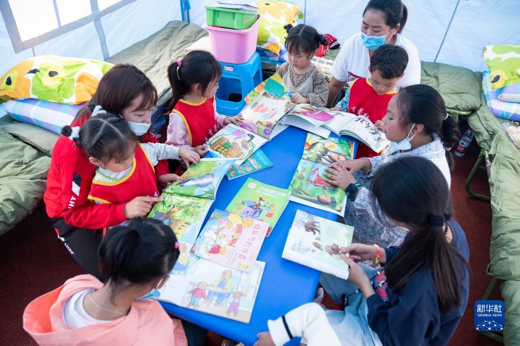 9月9日,在四川省石棉縣新民鄉海耳村臨時(shí)安置點(diǎn),老師帶領(lǐng)孩子們看書(shū)。