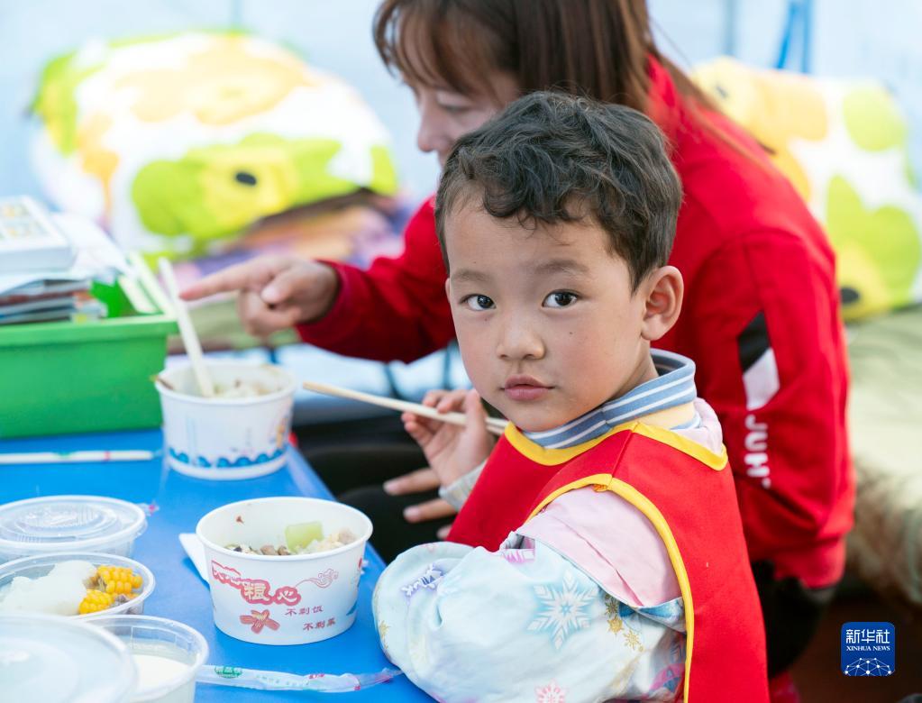 9月9日,在四川省石棉縣新民鄉海耳村臨時(shí)安置點(diǎn),小朋友在吃午飯。