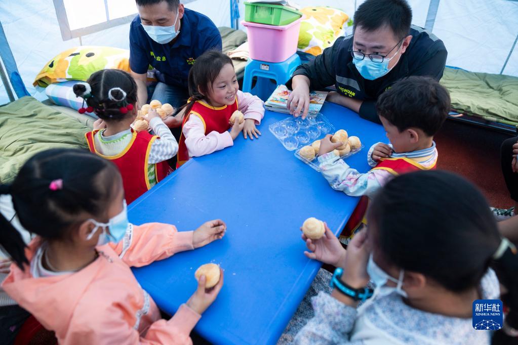 9月9日,在四川省石棉縣新民鄉海耳村臨時(shí)安置點(diǎn),四川省應急管理廳工作人員為孩子們送來(lái)中秋月餅。