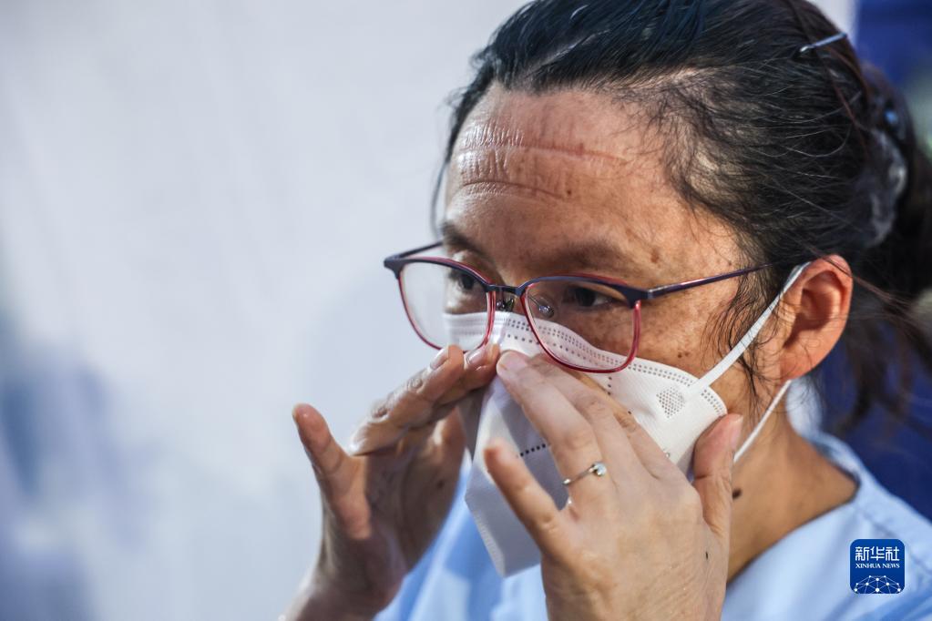 9月9日,六盤(pán)水市人民醫院檢驗科醫務(wù)人員何伶俐在移動(dòng)方艙外休息。摘下防護服后,面罩造成的勒痕清晰可見(jiàn)。