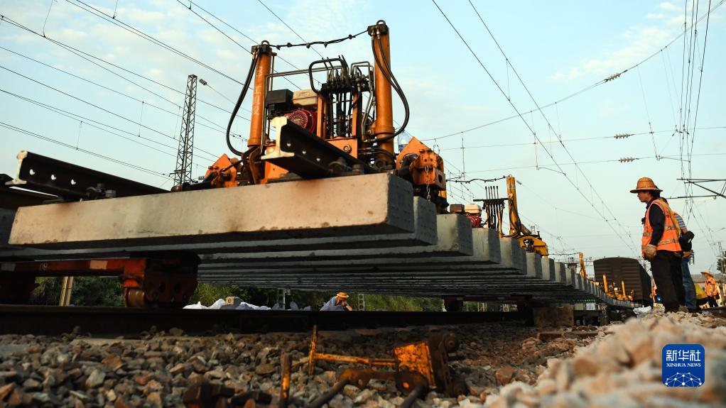 在柳州太陽(yáng)村站施工地,工人指揮機械推移新岔排到指定位置(9月9日攝)。