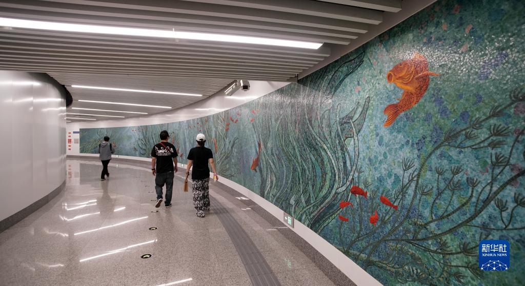中國山水畫(huà)風(fēng)格的北京地鐵19號線(xiàn)和2號線(xiàn)換乘走廊(9月9日攝)。