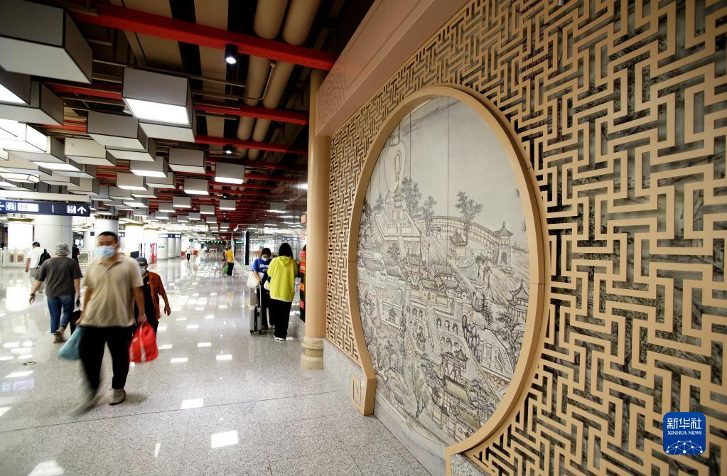 裝飾有中國古代山水畫(huà)壁畫(huà)的北京地鐵19號線(xiàn)站臺大廳(9月9日攝)。