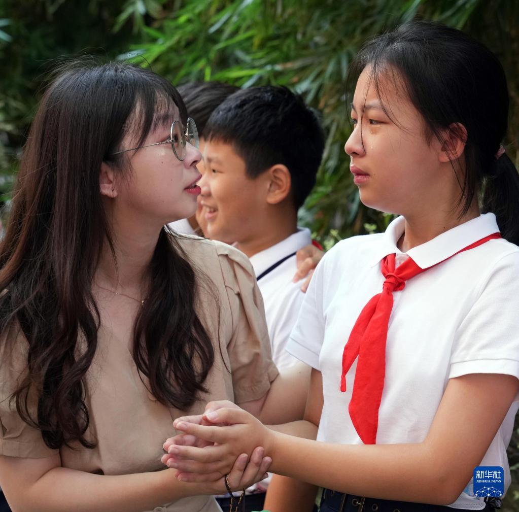 9月10日,畢業(yè)生離校時(shí)因不舍而流淚,班主任吳凝寒流著(zhù)淚安慰她。