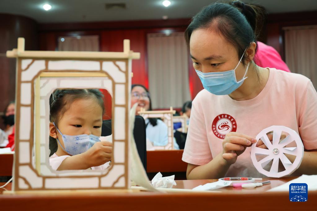 9月10日,在江蘇連云港市博物館,小朋友在家長(cháng)協(xié)助下制作走馬燈。