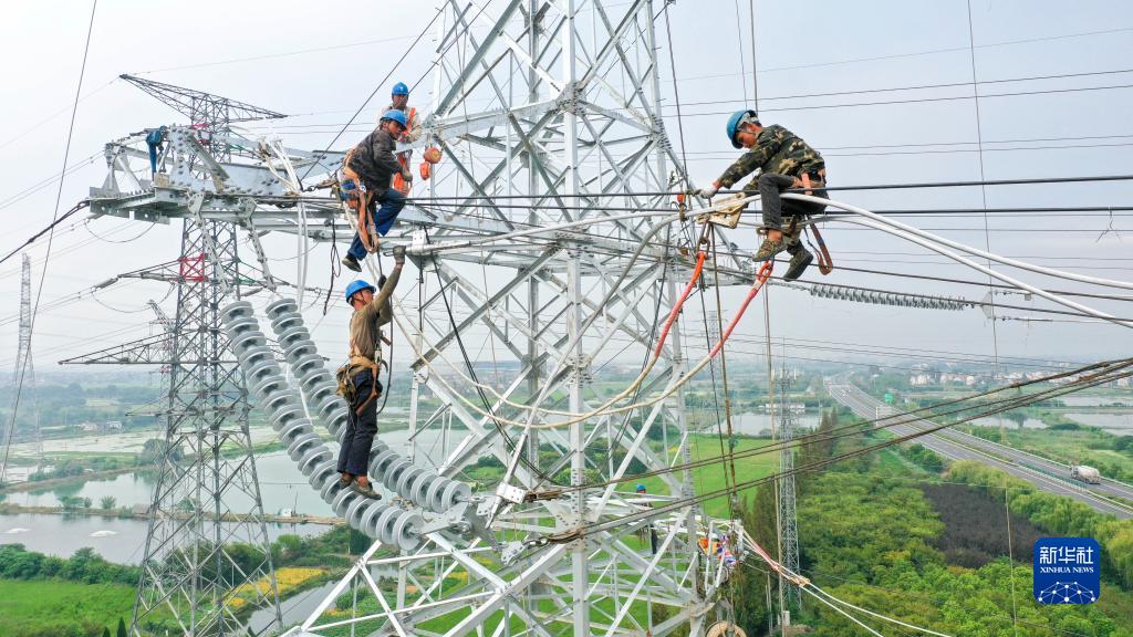 9月10日,在江蘇常州市的天目湖至余橋220千伏線(xiàn)路工程現場(chǎng),施工人員跨越S35阜溧高速架設導線(xiàn)(無(wú)人機照片)。