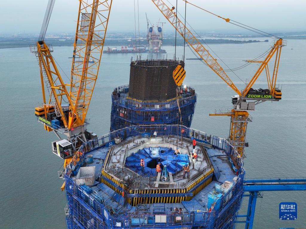 9月10日,中交二航局工人在位于江蘇泰州市的常泰長(cháng)江大橋建設項目工地作業(yè)(無(wú)人機照片)。