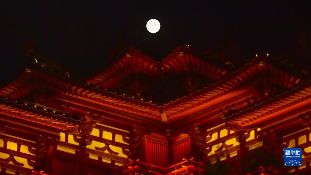 9月10日在河南省洛陽(yáng)市隋唐洛陽(yáng)城國家遺址公園應天門(mén)遺址博物館拍攝的圓月。