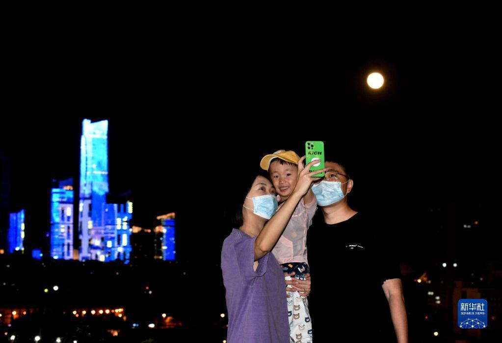 9月10日,在山東省青島市,市民與圓月合影。
