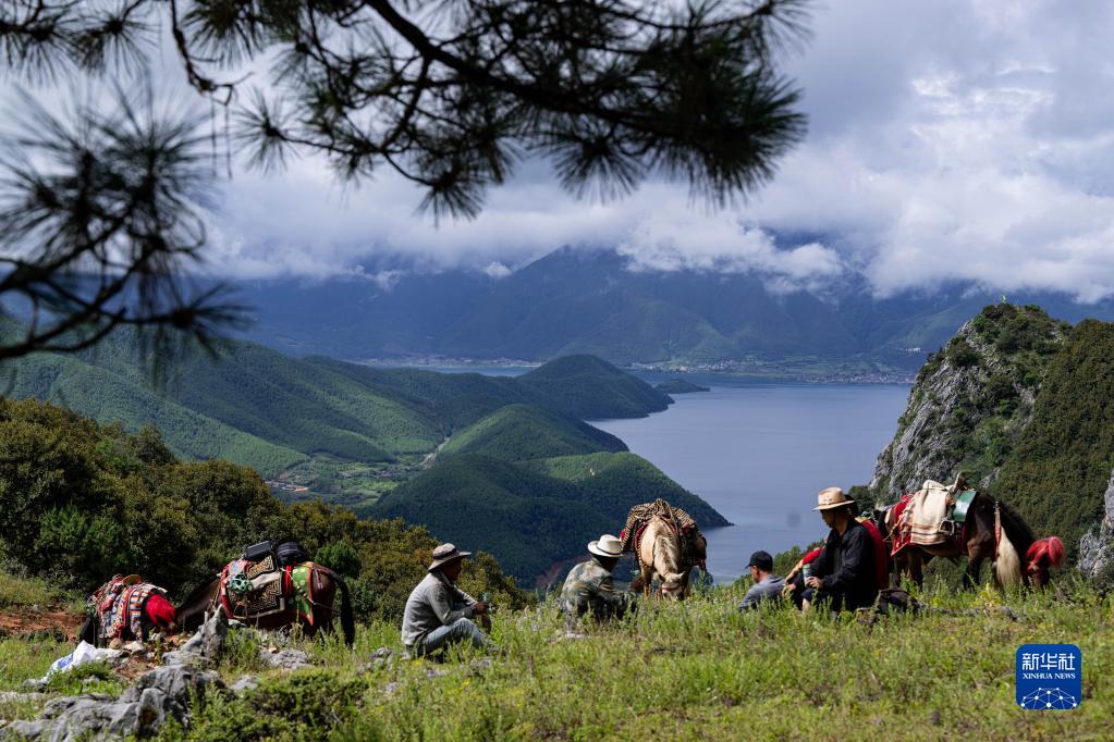 在四川省鹽源縣,瀘沽湖馬幫隊隊員們在返程途中唱著(zhù)山歌休憩(9月2日攝)。