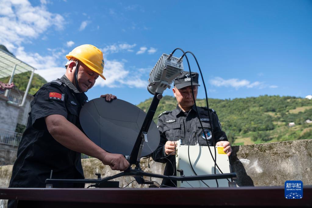 9月10日,在四川省石棉縣王崗坪彝族藏族鄉幸福村,技術(shù)人員廖華(左)與同事一起安裝衛星便攜站。