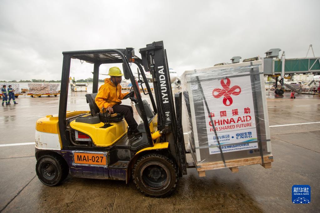 9月9日,在緬甸仰光國際機場(chǎng),工作人員搬運中國援助的新冠疫苗。