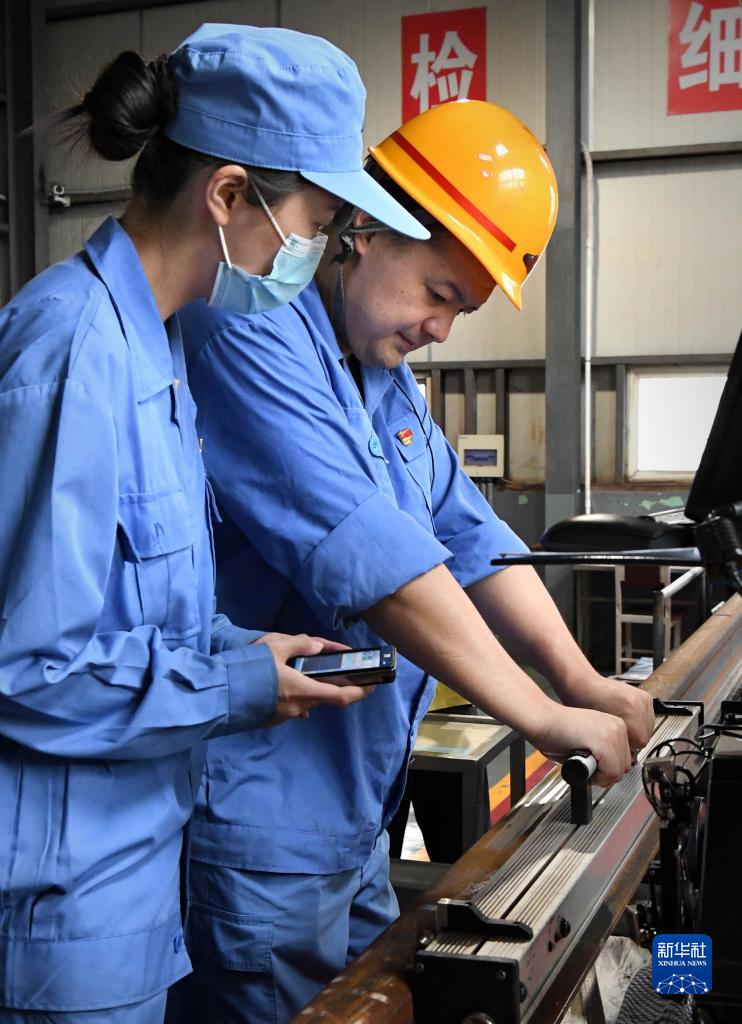 羅宇航(右)在鄭州工務(wù)機械段焊軌車(chē)間進(jìn)行鋼軌平直度測量(9月9日攝)。