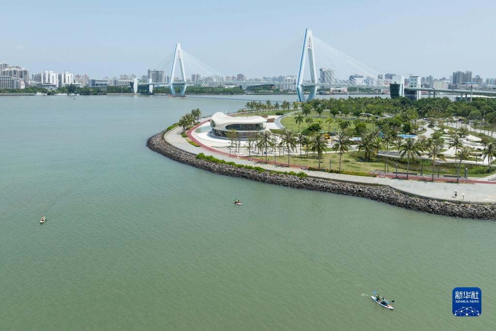 9月11日,市民在海南??谠贫磮D書(shū)館附近水上休閑玩耍(無(wú)人機照片)。