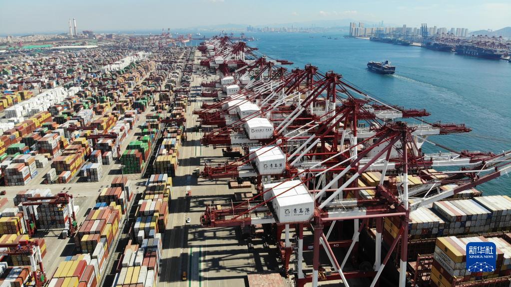 貨輪在山東港口青島港裝卸集裝箱(9月10日攝,無(wú)人機照片)。