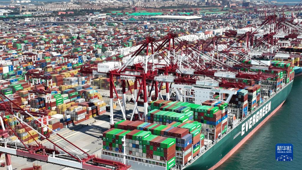 貨輪在山東港口青島港前灣三期集裝箱碼頭裝卸(9月10日攝,無(wú)人機照片)。