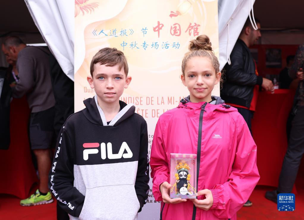 9月10日,在法國巴黎近郊舉辦的法國共產(chǎn)黨《人道報》節上,兩名法國小朋友在中國館外與義賣(mài)的戲曲人物泥塑合影。