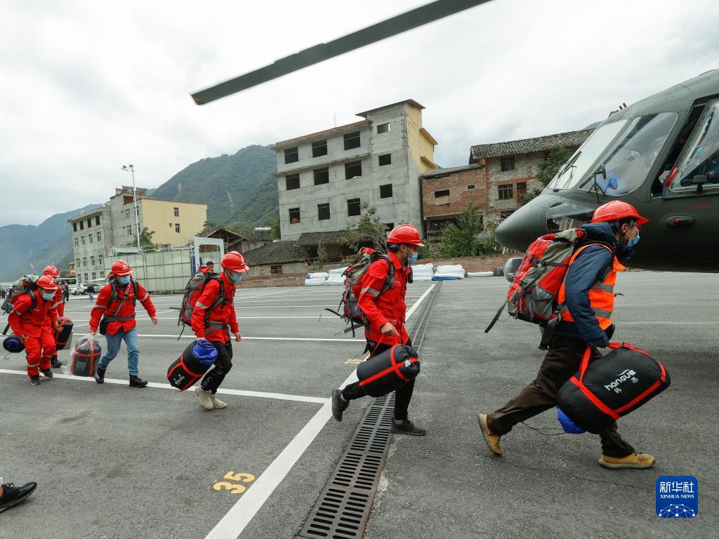 9月7日,在四川省甘孜州瀘定縣磨西鎮,四川省冶勘設計集團有限公司的6名調查隊員攜帶裝備搭乘直升機前往海螺溝景區開(kāi)展地質(zhì)災害應急排查工作。