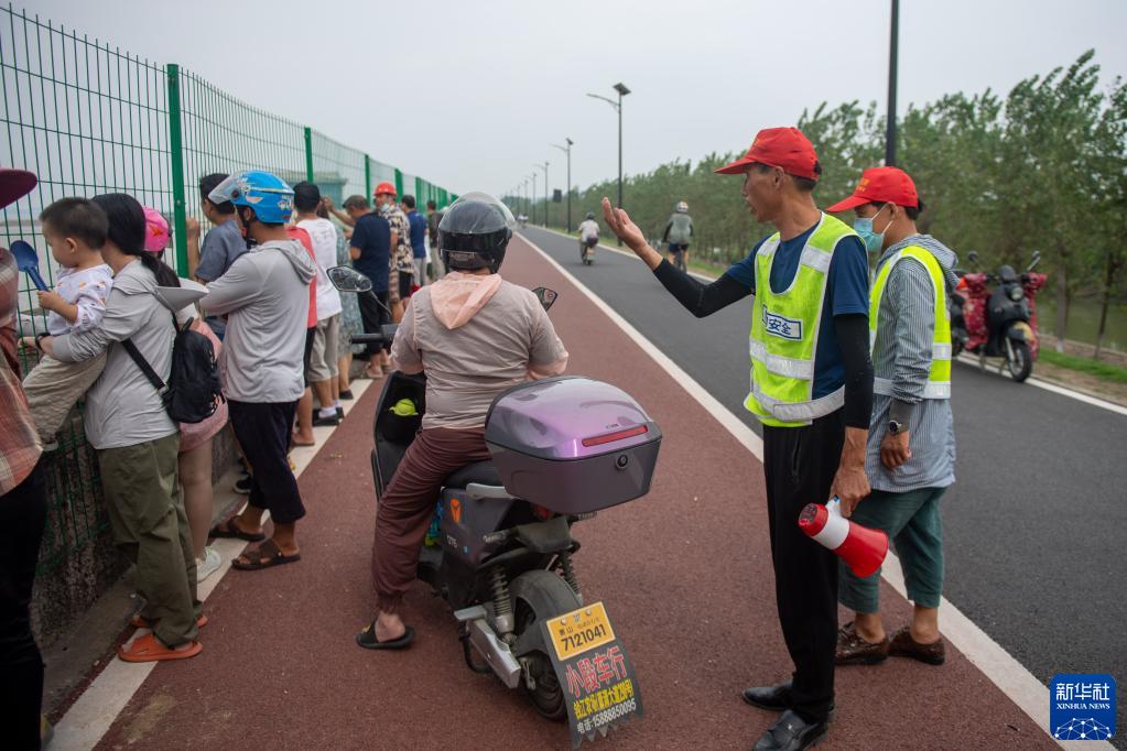 9月12日,防潮隊員傅幫華(右二)勸導觀(guān)潮人將電動(dòng)車(chē)停放至安全區域,避免潮水襲來(lái)發(fā)生危險。