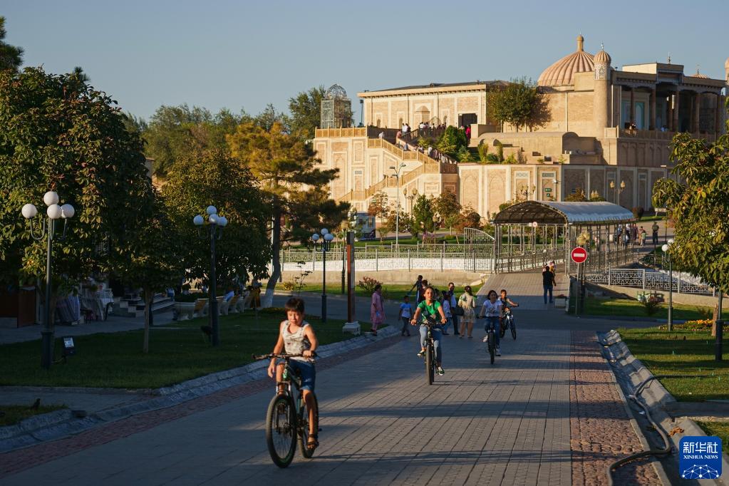 9月3日,在烏茲別克斯坦撒馬爾罕,人們騎車(chē)游覽。