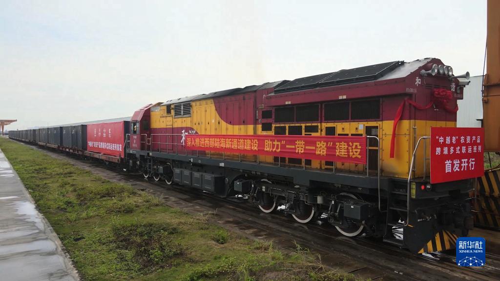 這是在南寧國際鐵路港拍攝的“中越老”農資產(chǎn)品跨境多式聯(lián)運班列(2021年5月13日攝)。