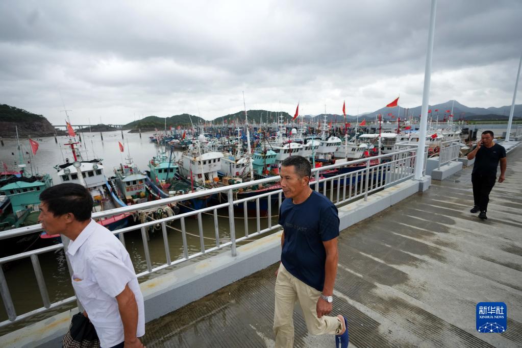 9月13日,在浙江省寧波市象山縣新橋崇站避風(fēng)錨地,當地漁民從避風(fēng)的漁船邊走過(guò)。