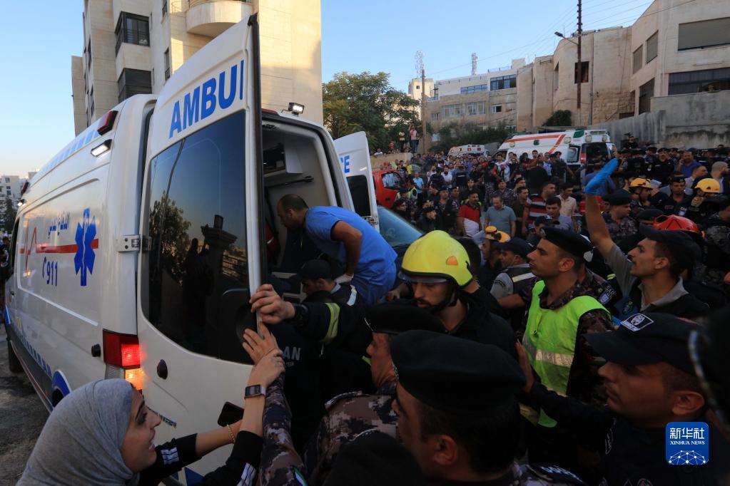 9月13日,在約旦首都安曼的居民樓倒塌事故現場(chǎng),救援人員將傷者轉移到救護車(chē)上。