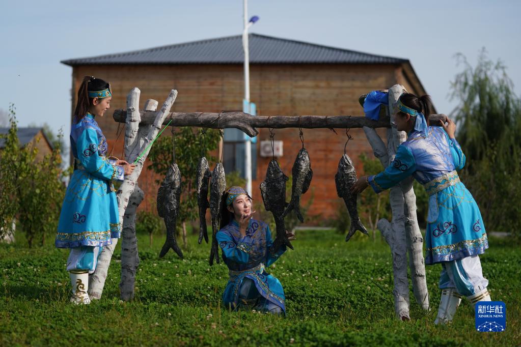 9月4日,在黑龍江撫遠市烏蘇鎮抓吉赫哲族村,尚美含(中)和赫哲族姑娘進(jìn)行民俗展示。