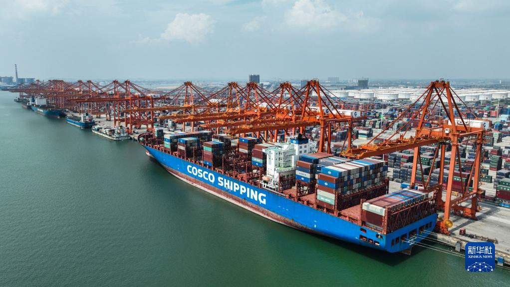 多艘海輪停泊在欽州港集裝箱碼頭裝卸貨物(2022年9月13日攝,無(wú)人機照片)。