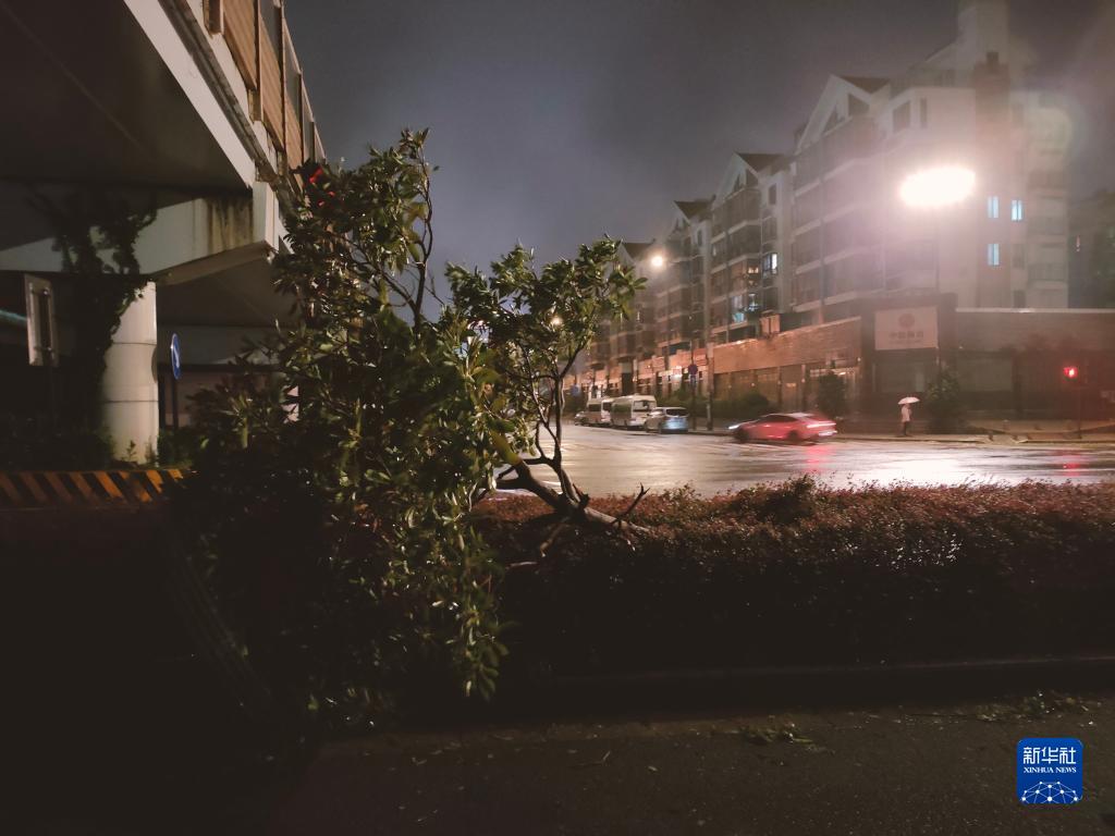 9月14日晚拍攝的浙江省舟山市普陀區東港海洲路綠化帶上被風(fēng)吹倒的樹(shù)木(手機照片)。