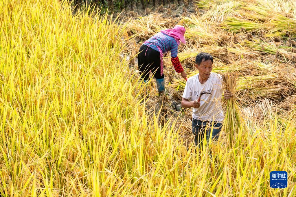 9月14日,在重慶市酉陽(yáng)土家族苗族自治縣花田鄉,稻農在稻田里搶收稻谷。 新華社記者 唐奕 攝